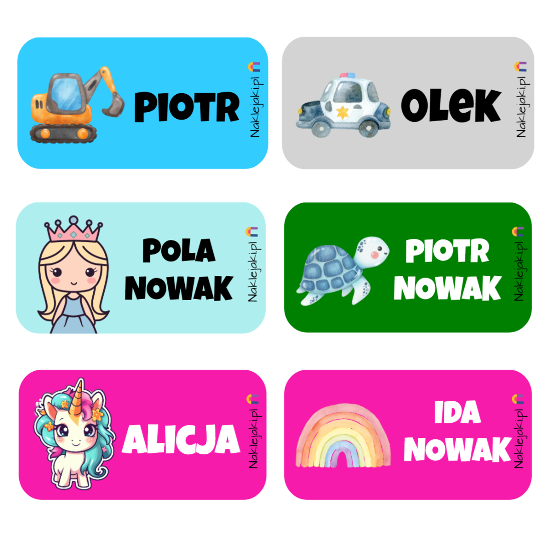 Naklejki na ubrania z imieniem oraz ciekawymi motywami dziecięcymi do wyboru. ✓Idealne do oznaczania ubrań oraz rzeczy do szkoły, przedszkola i na obozy. ✓Wodoodporne, nadają się do zmywarki, prania w pralce i suszenia w suszarce bębnowej. ✓Bardzo odporne na ścieranie dzięki nowoczesnej technologii.✓ Bardzo mocny klej, dzięki któremu naklejka zostaje na swoim miejscu przez niesamowicie długo czas. ✓Naklejka jest elastyczna i przyjemna w dotyku, nie irytuje skóry. ✓Naklej na metkę z instrukcją pielęgnacji lub logo producenta, nie bezpośrednio na tkaninę ubrania. Po prostu odklej i przyklej mocno do wybranej powierzchni. ✓Wybierz spośród szerokiej gamy motywów nie tylko dla dzieci!